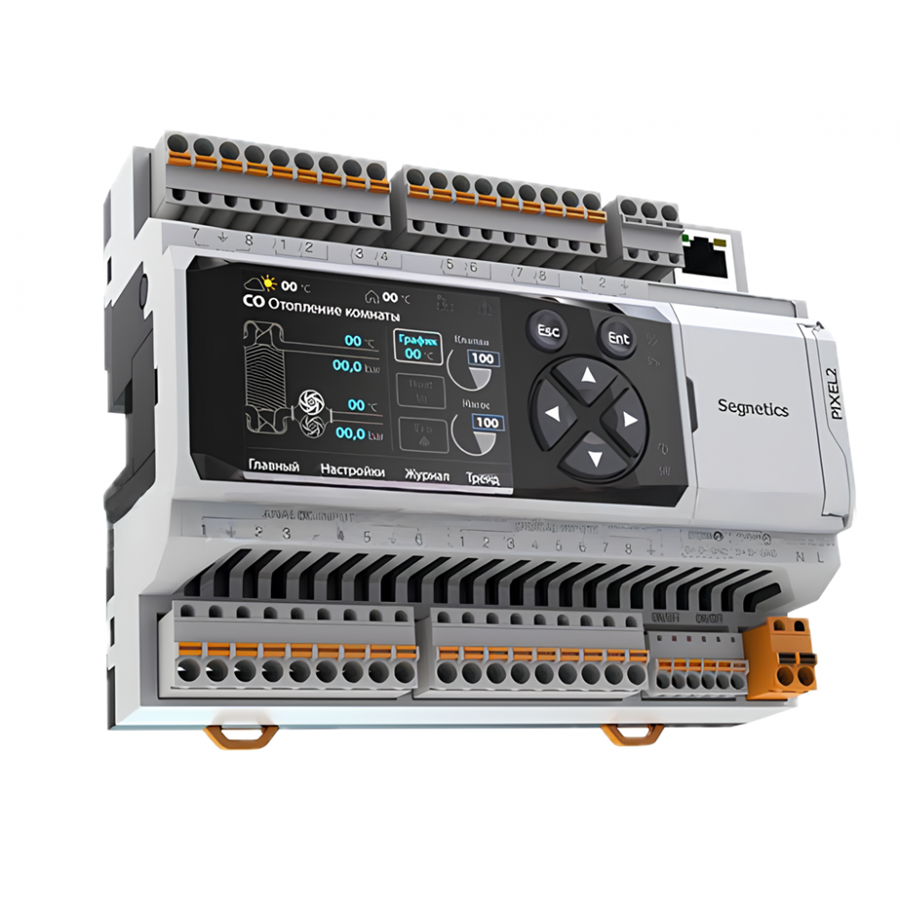 Segnetics Pixel2-1321-70-4 с дисплеем, 6 аналоговых входов, 4 аналоговых выхода, 8 дискретных входов, 5 дискретных выходов (реле), 2 дискретных выхода (симистор), 1 дискретный выход (оптореле)